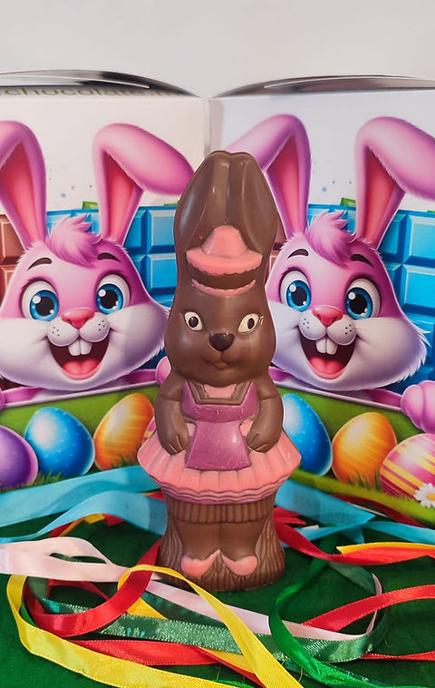 Milk Chocolate Ballerina Bunny with edible coloured highlights.