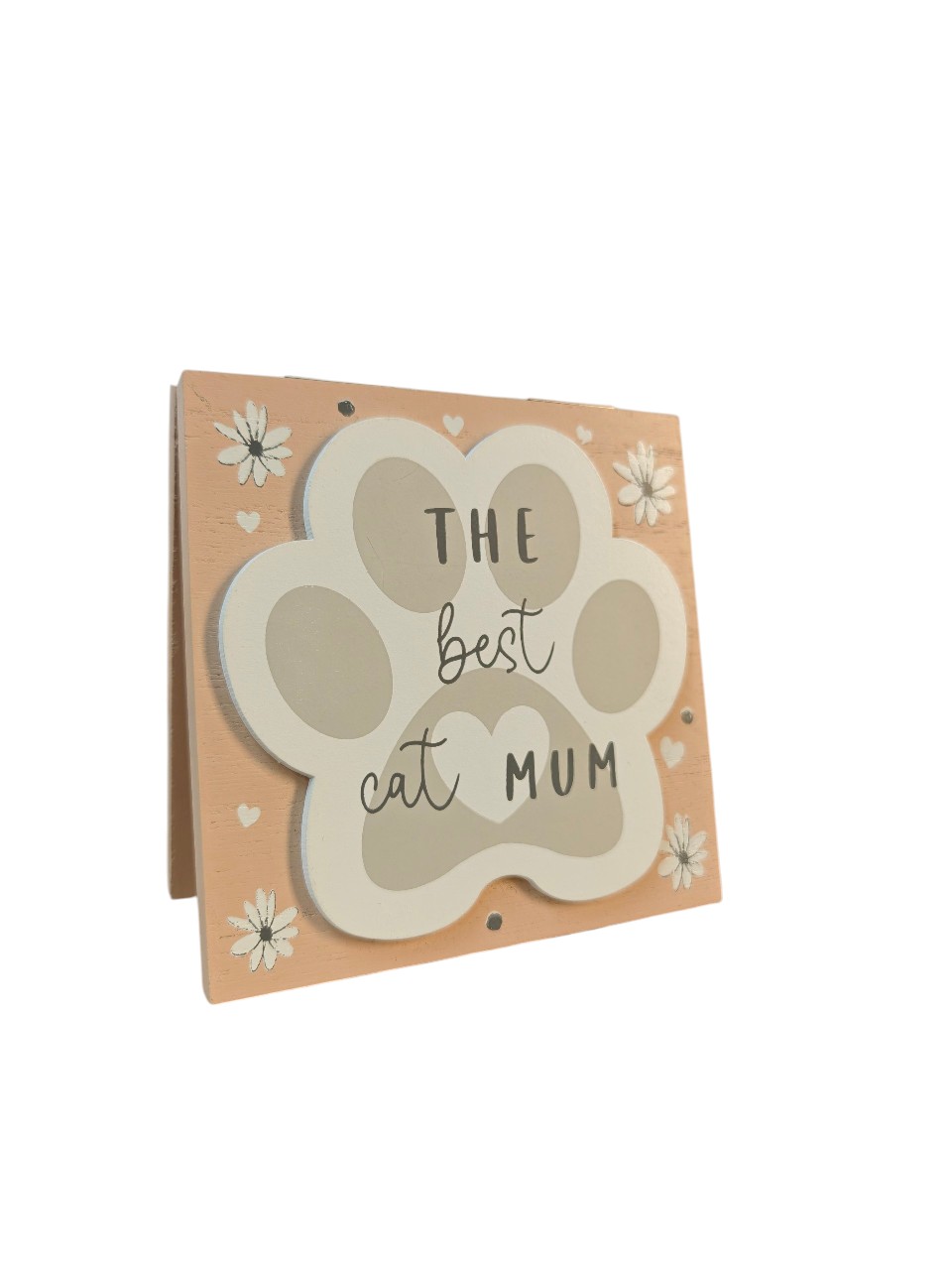 Celebrate the love between a cat mum and her feline friend with this adorable wooden paw-shaped plaque. Featuring the sweet message “The Best Cat Mum” and a soft, charming design, this decorative piece makes a lovely keepsake for any proud cat parent.