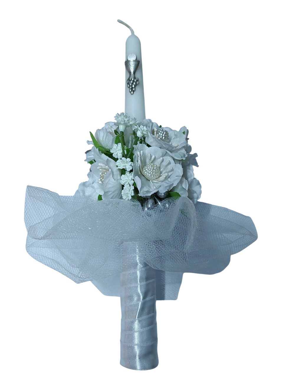 This elegant bouquet features a decorated candle surrounded by delicate white florals, soft tulle, and satin ribbon. Each piece is carefully handcrafted with love and attention to detail, making every bouquet truly unique.