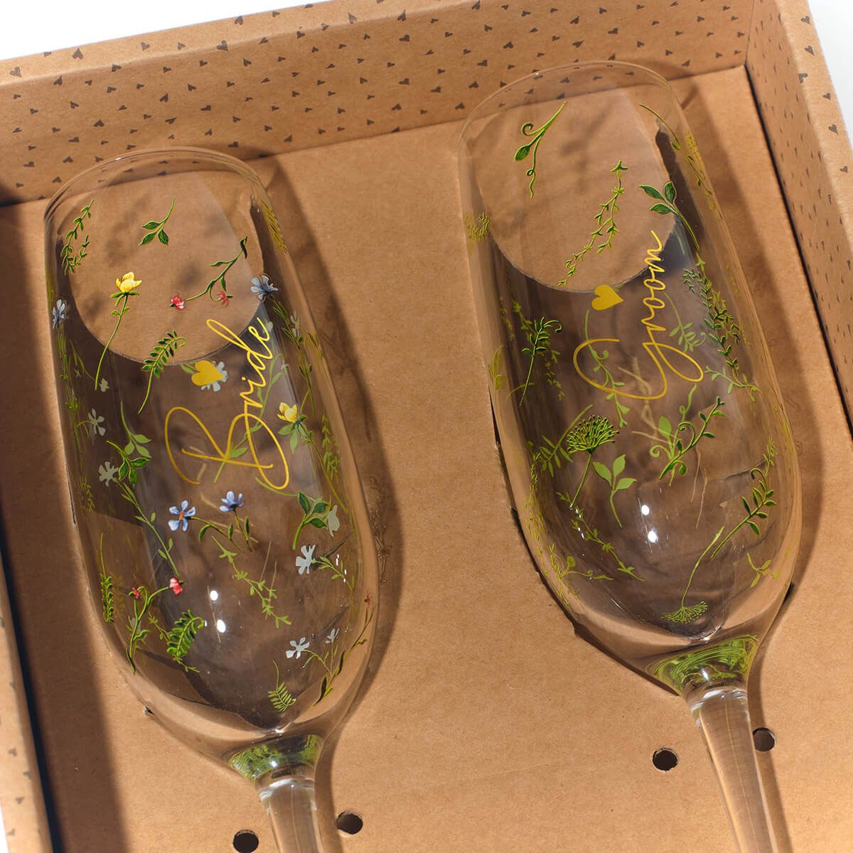 Celebrate love and special moments with this elegant set of champagne glasses, beautifully decorated with delicate floral and botanical details and the words Bride and Groom. Their graceful design adds a romantic touch to any celebration, making them perfect for weddings, engagements, anniversaries, or bridal gifts.