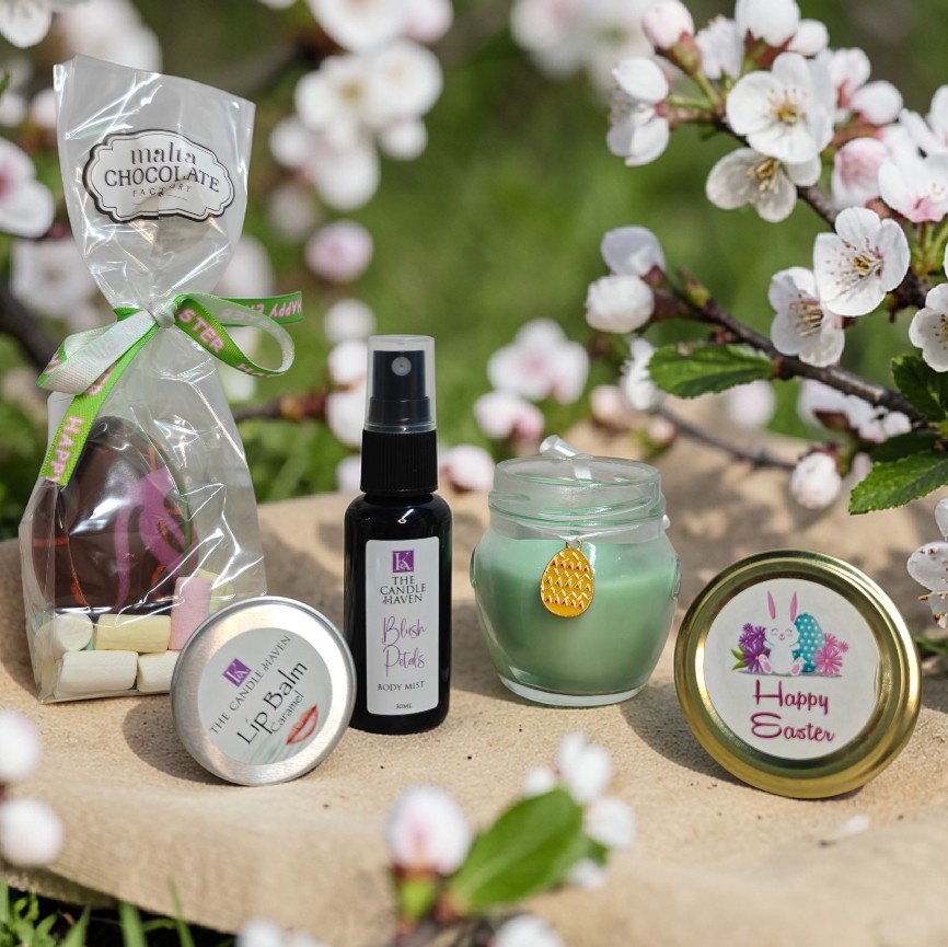 The set includes a relaxing massage scented candle, a refreshing body mist, a nourishing lip balm, and a delicious chocolate Easter egg with marshmallows.