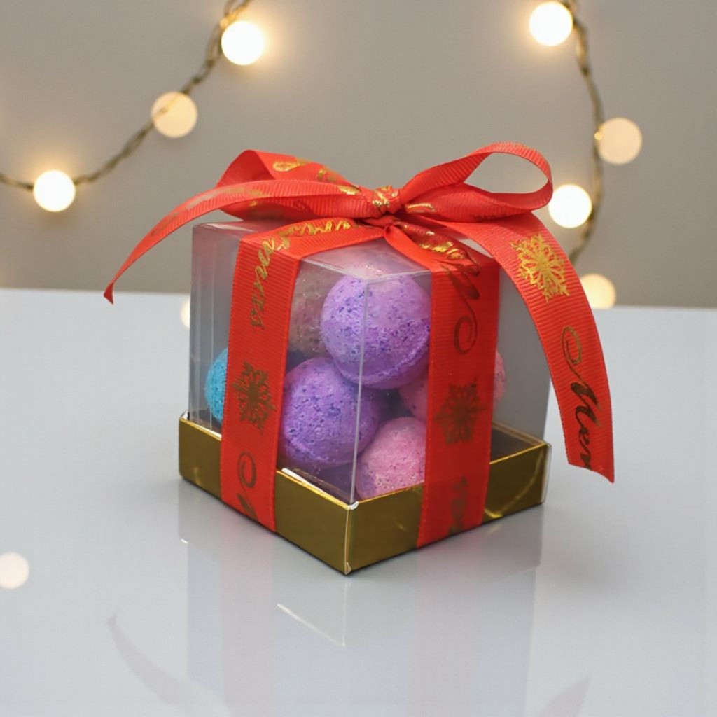 A delightful set of 10 mini bath bombs, beautifully packed in a festive gift box topped with a red ribbon 🎀