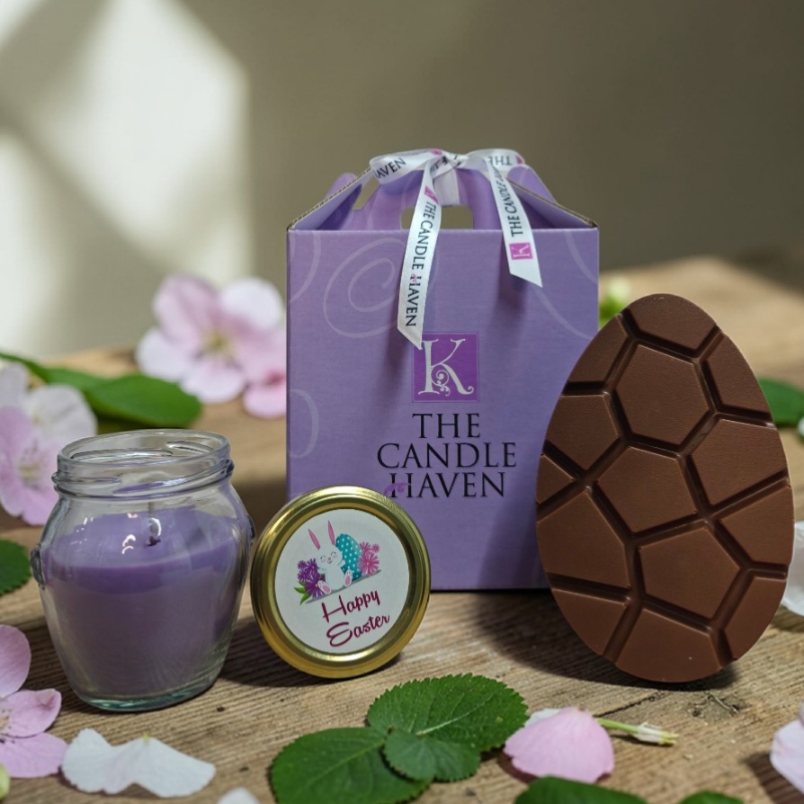 Paired with a cracked chocolate Easter egg, this gift set offers the perfect balance between a sweet indulgence and a comforting home fragrance.