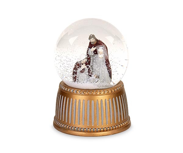 Features: Holy Family figurines inside a snow globe with golden base