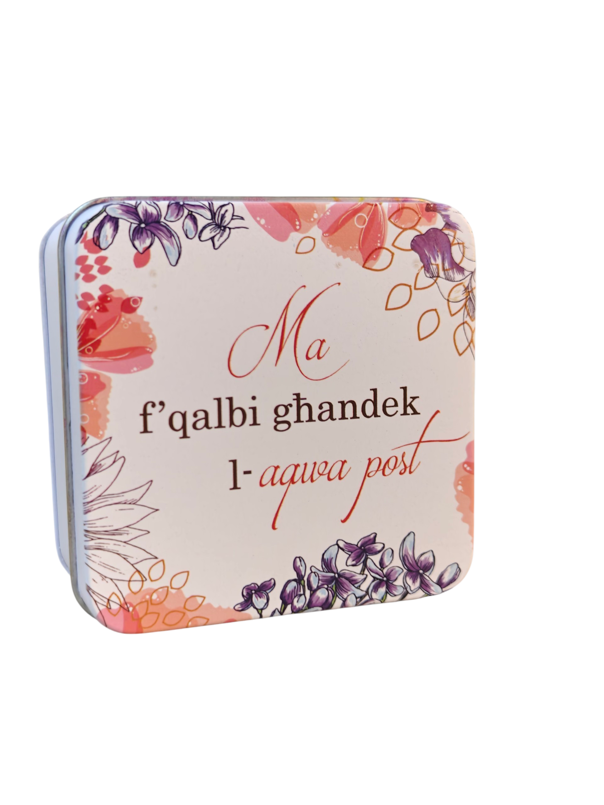 This beautiful decorative tin keepsake box features a lovely floral design and the heartfelt Maltese message: “Ma f’qalbi għandek l-aqwa post”(In my heart, you have the best place).