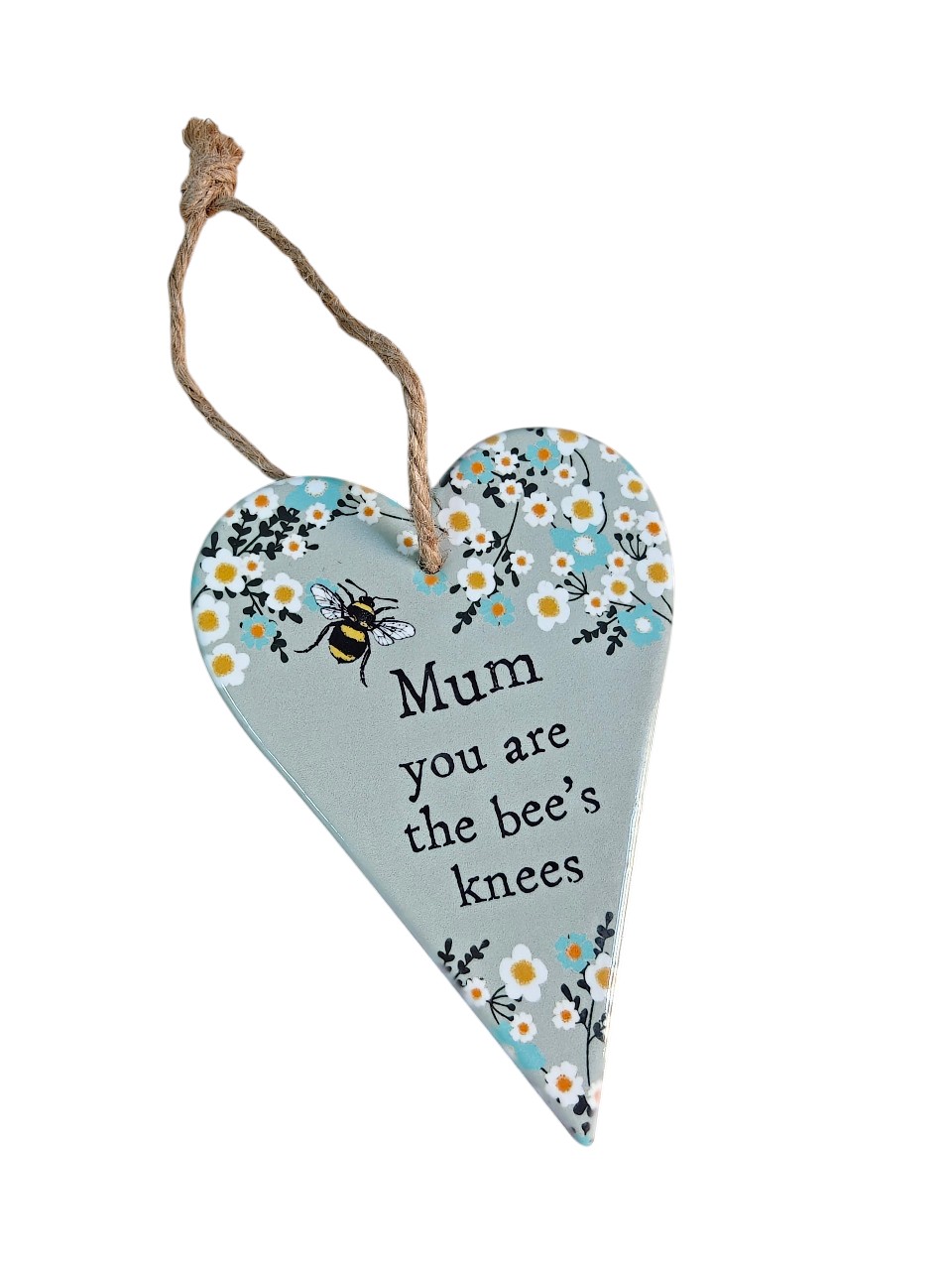 Show Mum just how special she is with this charming heart-shaped hanging plaque, featuring a sweet bee and floral design and the loving message “Mum you are the bee’s knees.” With its soft colours and rustic twine hanger, this decorative piece adds a warm and cheerful touch to any home.