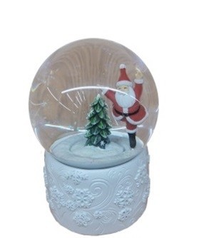 Bring festive cheer to your home with this musical snow globe, featuring Santa joyfully dancing beside a Christmas tree. Set on an elegant white base embossed with delicate snowflake patterns, it adds a touch of winter magic to any décor.