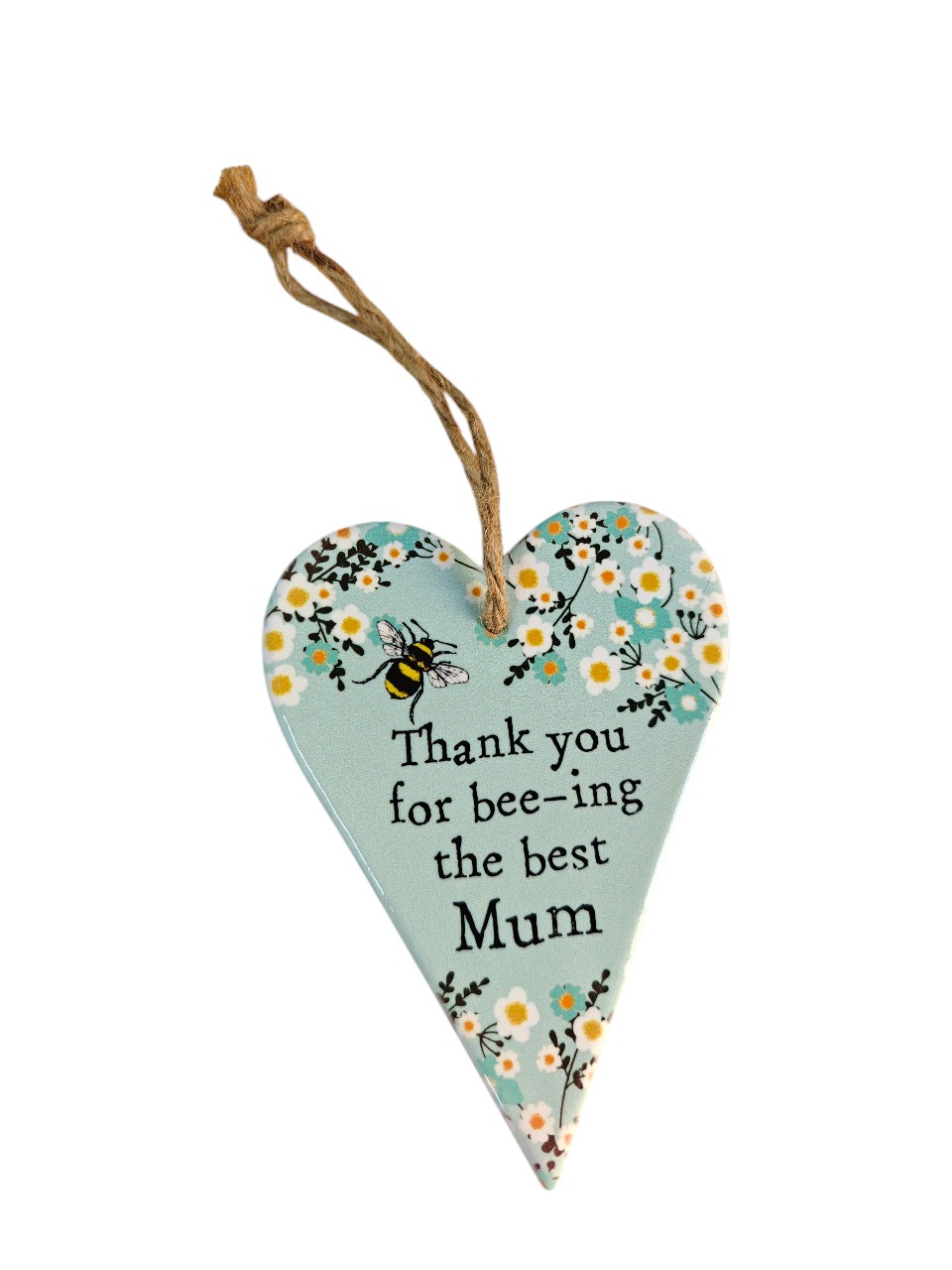 Show Mum just how special she is with this charming heart-shaped hanging plaque, featuring a sweet bee and floral design and the loving message. With its soft colours and rustic twine hanger, this decorative piece adds a warm and cheerful touch to any home.