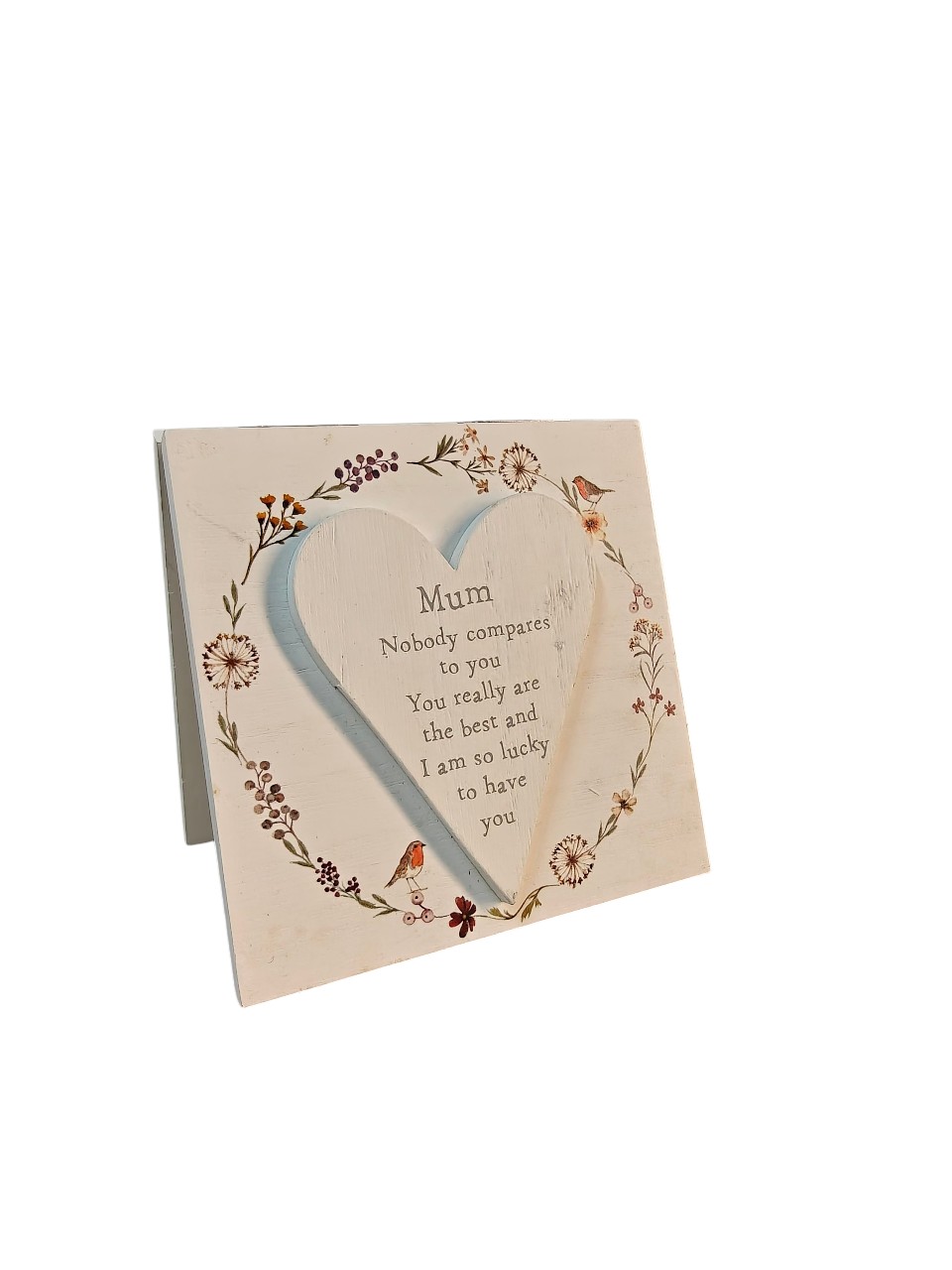 Show Mum just how much she means to you with this beautiful wooden heart card block, featuring a delicate floral and bird design and a heartfelt message: